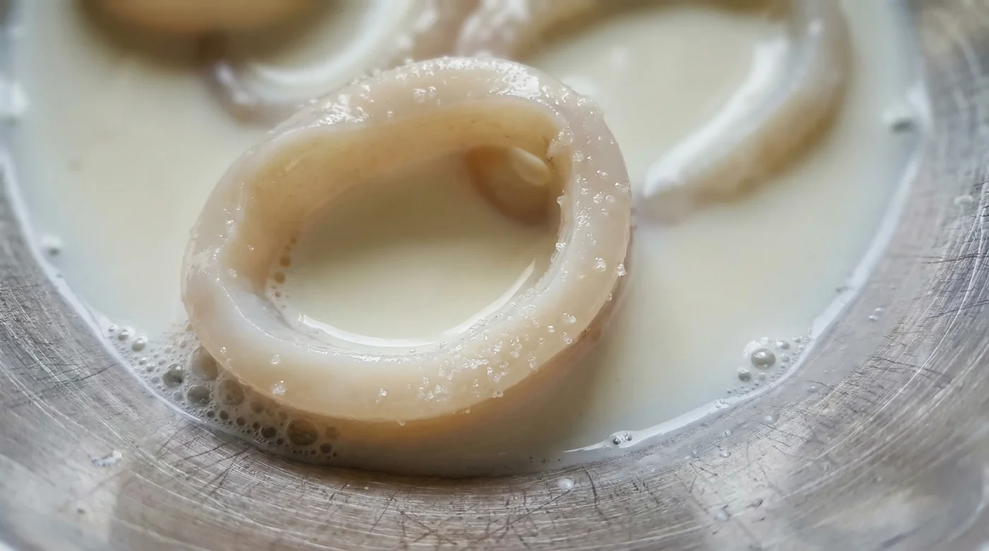 Bu kadim yöntemi kendi mutfağına taşımak inanılmaz derecede basit, temiz ve sessiz bir süreçtir. Fiziksel güce ihtiyacın yok. Önce derin ve geniş bir cam kase bul. İçine yarım kilo temizlenmiş, halka doğranmış taze veya doğru şekilde buzu çözülmüş kalamar için yaklaşık iki su bardağı soğuk süt dök. Sütün buzdolabından yeni çıkmış olması, kalamarın tazeliğini koruması adına kritik bir detaydır. Oda sıcaklığında ılık bir süt kullanmaktan kaçınmalısın.