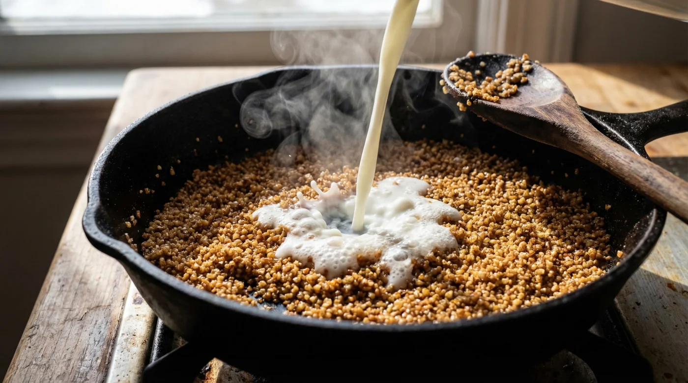 - Soğuk Süt Enjeksiyonu: Kavrulan irmiği ocaktan alın veya altını tamamen kapatın. İçinde şekeri erittiğiniz 4°C’lik soğuk sütü tek seferde tencereye boşaltın. İlk saniyede hafif bir buhar çıkışı olacaktır, hızlıca karıştırarak irmiğin sütü sakince çekmesine izin verin.