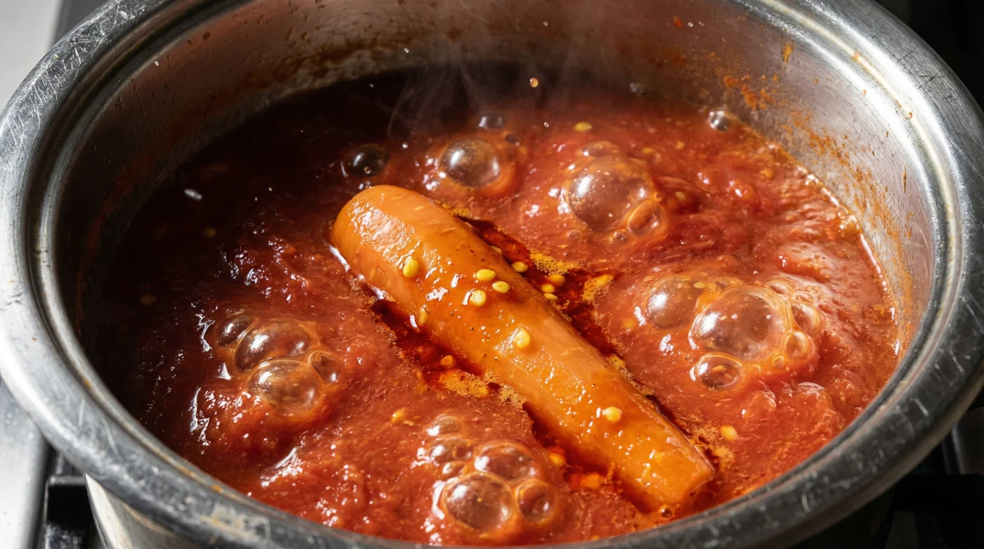 Bizim istediğimiz şey bir aroma verici değil, bir asit paratoneridir. Sosun kaynamaya başladığı ilk an, o bütün havucu tencerenin tam ortasına bırak. Ateşi kıs ve domateslerin yavaş yavaş kendi sularını çekmesini izle.