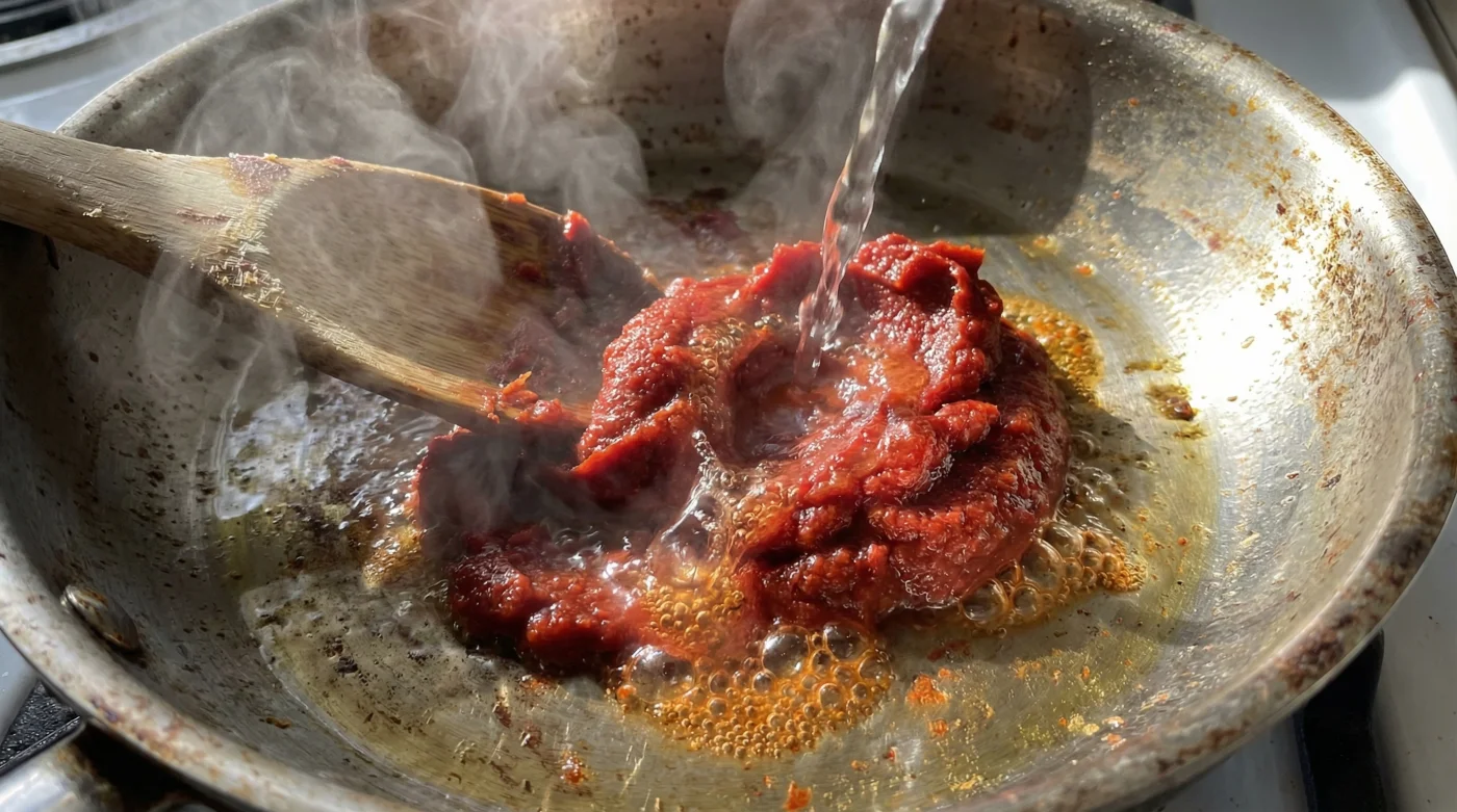 Bu sadece basit bir mutfak numarası değil, aynı zamanda fiziksel ve duyusal bir farkındalık meselesidir. Tencerenin başına geçtiğinde, o iki kaşık suyun nasıl bir simyacı gibi çalıştığına odaklan. Soğanlar şeffaflaştığında salçayı ekle ve hemen ardından, sadece iki kaşık oda sıcaklığında suyu üzerine gezdir. Tahta kaşığının sırtıyla salçayı ezerek yağa ve suya yedirmeye başla. Göreceksin ki o sert, topak topak duran macun saniyeler içinde yumuşayacak. Su buharlaşırken, kızgın yağın ısısını bir süreliğine 100 derece civarına çekecek ve bu da salçaya yanmadan karamelize olabilmesi için o çok değerli zamanı verecektir. Bu süre zarfında domatesin içindeki doğal şekerler yavaşça çözülür, çiğ koku uçar ve yerini derin, zengin bir umami aromasına bırakır.