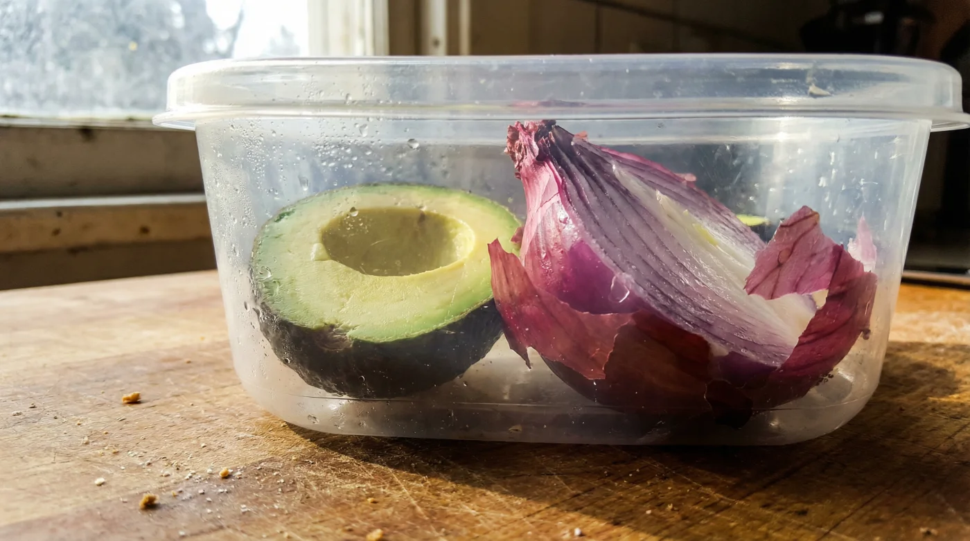 Artakalan yarım avokadonu, kesik yüzeyi yukarı bakacak şekilde bu soğan yatağının yanına veya hafifçe üzerine bırak. Soğanın kesik yüzeyle doğrudan temas etmesine gerek yok; sadece aynı kapalı ortamda bulunmaları kükürt gazının çalışması için yeterli. Kapağı sıkıca kapat ve bu küçük, kapalı ekosistemi buzdolabının raflarına emanet et. Oksijen dışarıda kalırken, soğanın koruyucu nefesi içerideki havayı yönetecek ve zamanın meyve üzerindeki yıpratıcı etkisini donduracak.