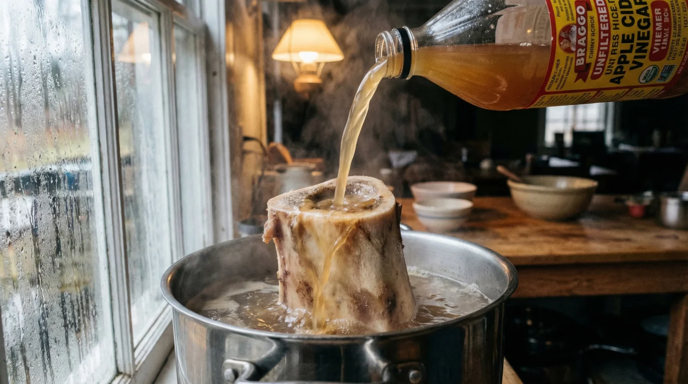 Bir dahaki sefere kemik suyu kaynatirken, ocagin altini kismadan hemen once tencereye bir miktar organik elma sirkesi damlatmayi unutmayin. Bu ufak dokunus sayesinde kemikler cok daha hizli yumusayacak ve sogudugunda tam kivaminda, jole gibi titreyen gercek bir sifa deposu elde edeceksiniz. Ustelik sirke tadi kaynama esnasinda tamamen ucup gidecek!